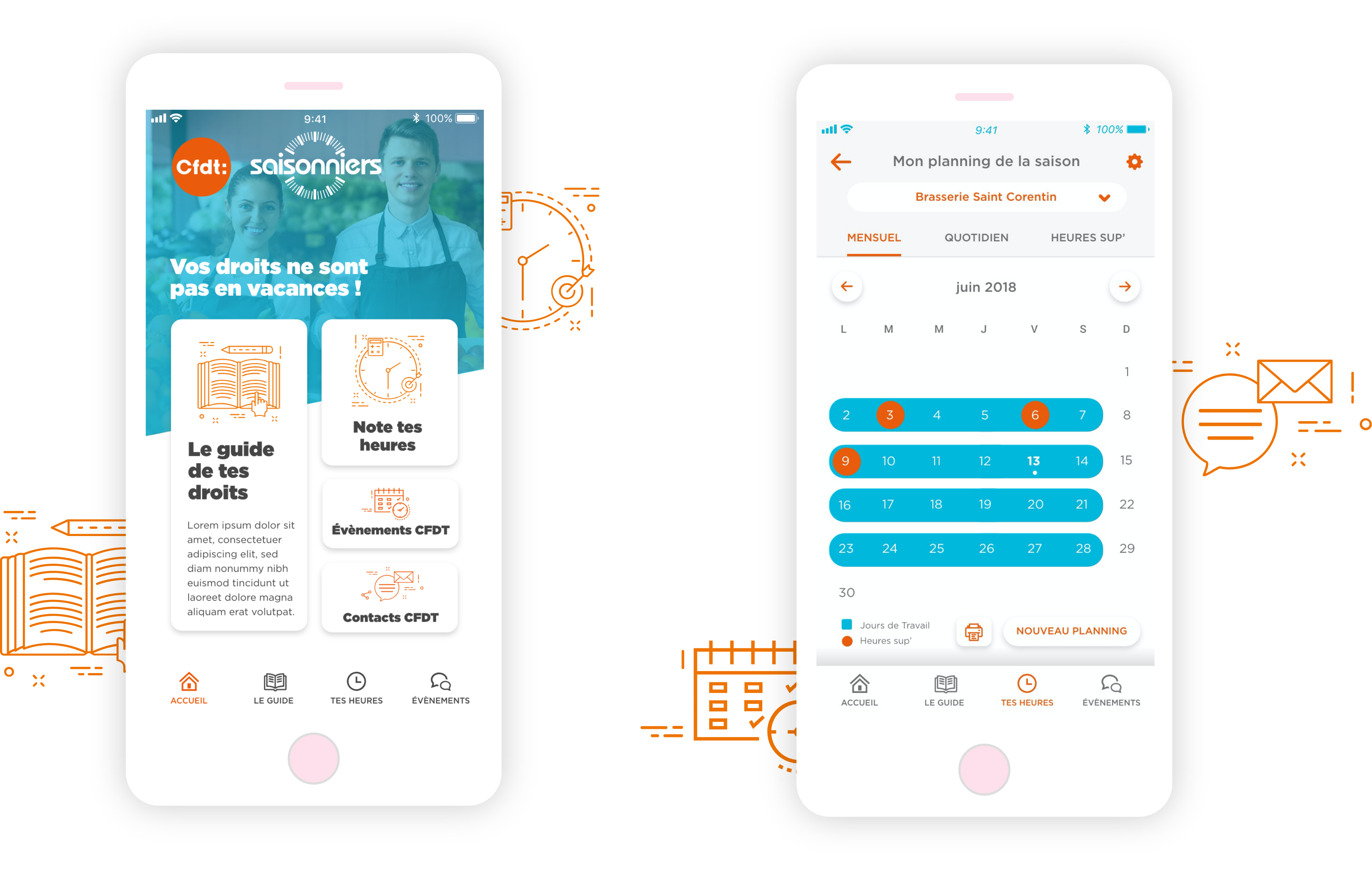 Réaliser une application mobile iOS et Android pour aider les saisonniers à mieux connaître leurs droits, rentrer leur planning de travail et noter leurs heures supplémentaires. Cela a permis au client d'imprimer moins de brochure papier et d'atteindre son coeur de cible avec un outil de communication adapté et interactif.